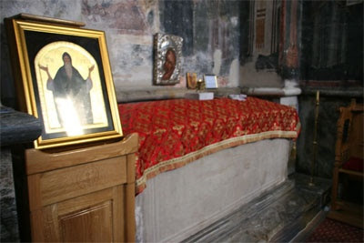 | Ο τάφος του Αγ.Συμεών στην Μονή Στουντενιτσα μετά την μεταφορά από την Μονή Χιλανδαρίου |